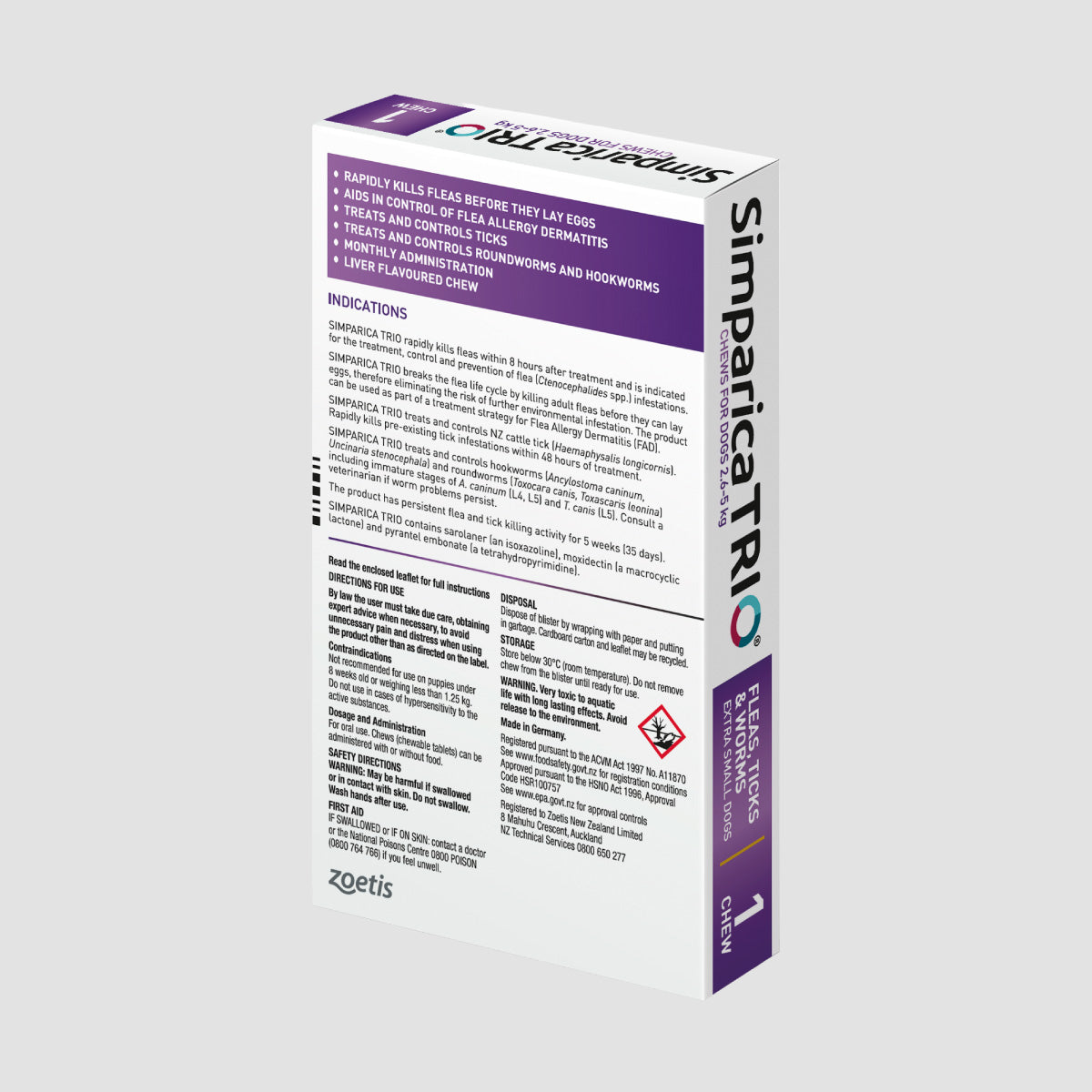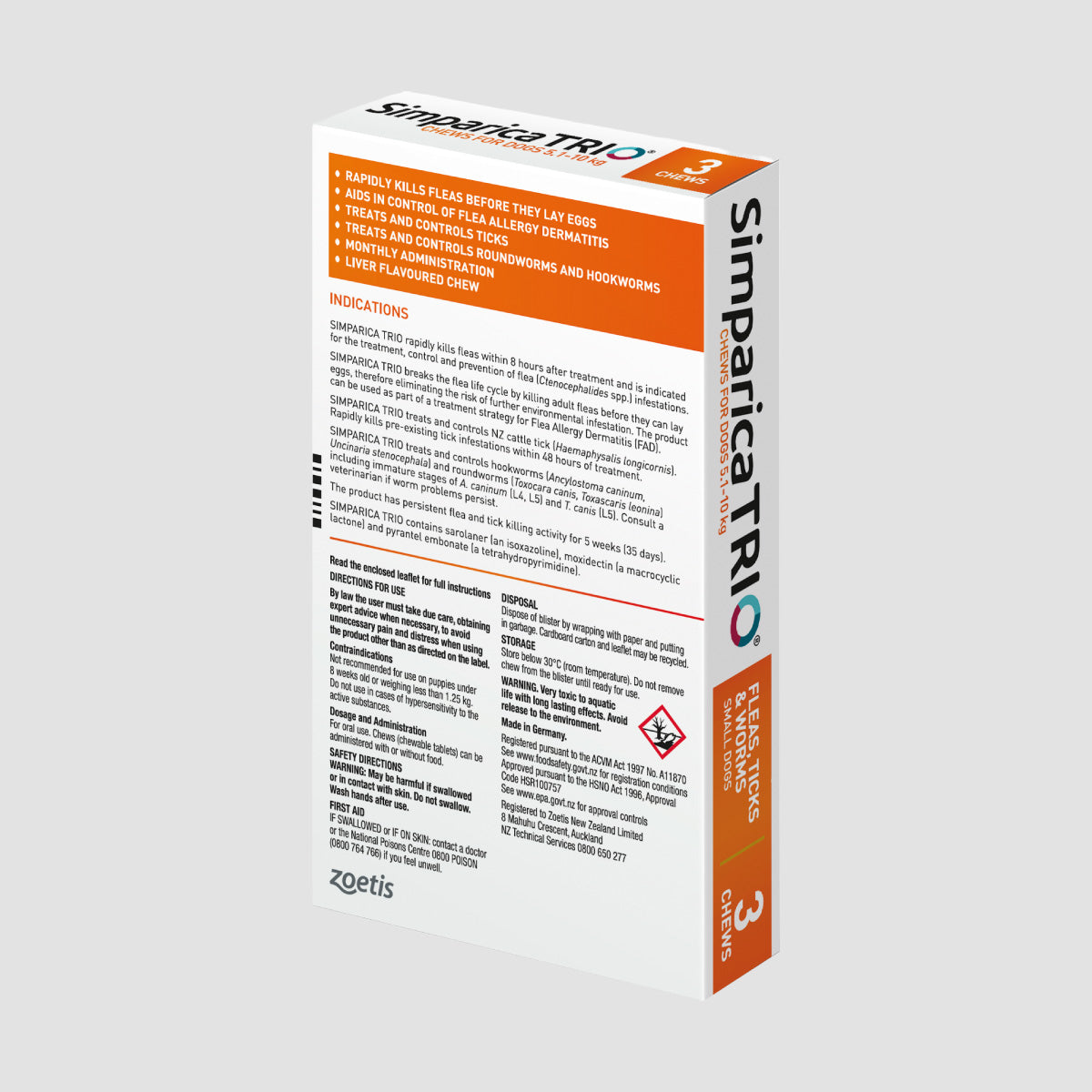 Not recommended for use on puppies under 8 weeks old or weighing less than 1.25 kg. Do not use in cases of hypersensitivity to the active substances. The safe use of Simparica Trio has not been evaluated in breeding dogs and pregnant or lactating bitches.